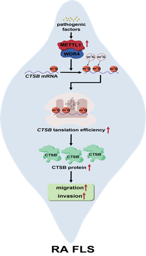 研究发现,RA患者滑膜组织及FLSs中METTL1表达及m7G修饰水平显著升高,且与疾病活动度呈正相关。敲低METTL1能有效抑制RA FLSs侵袭能力和基质金属蛋白酶9(MMP9)的表达。体内研究证实,敲低METTL1可显著降低RA动物模型的关节炎严重程度。机制上,METTL1通过催化组织蛋白酶B(CTSB)mRNA 5'非翻译区(5' UTR)的特定位点发生m7G甲基化,从而增强CTSB mRNA的翻译效率,最终促进CTSB蛋白的合成与分泌。该研究不仅阐明了METTL1-m7G-CTSB轴是驱动RA滑膜侵袭和关节破坏的一个全新表观转录调控机制,也为开发以METTL1为靶点的RA精准治疗提供了坚实的实验基础。