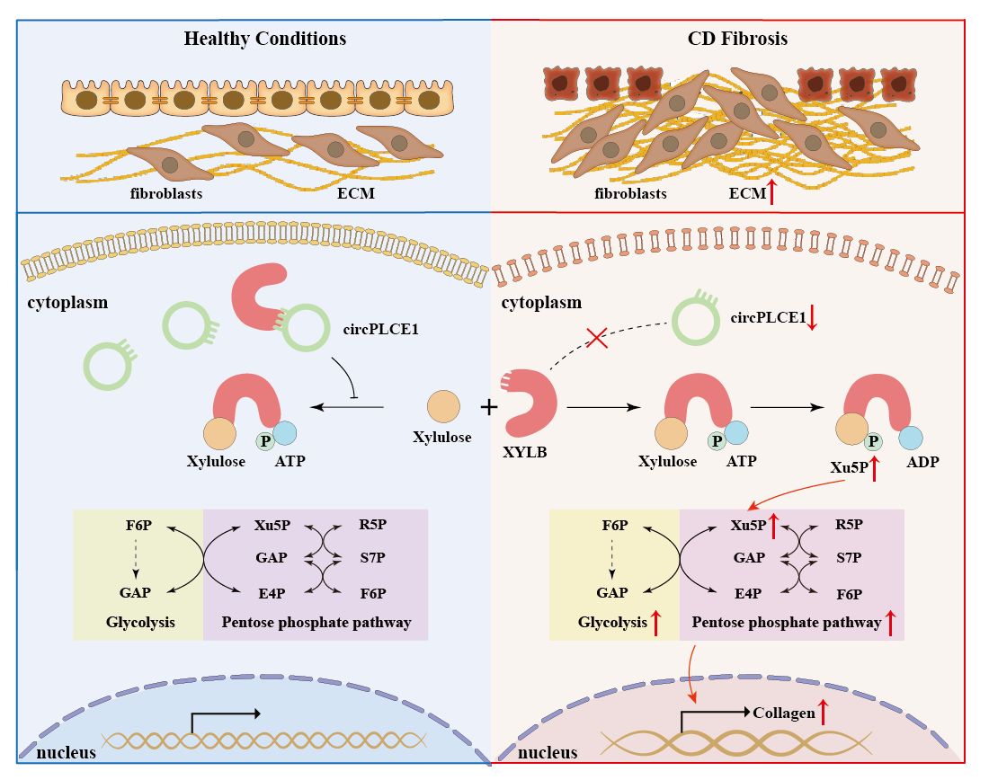 该研究系统揭示了成纤维细胞中circPLCE1/XYLB/Xu5P调控轴在CD肠道纤维化中的关键作用,为CD肠道狭窄的精准干预提供了潜在的治疗靶点。附属第一医院消化内科毛仁、陈旻湖教授为共同通讯作者,中山一院消化内科博士后周龙源、聂静博士生、硕士生冯芷茵、硕士生李荣昌为共同第一作者。相关研究发表在胃肠病学顶级期刊《Gut》(IF=25.8,中科院1区)。