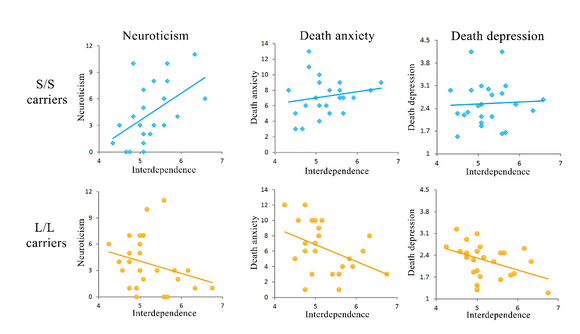 罗思阳等随后在大样本范围内测量了个体的5-HTTLPR基因类型,并招募了24名S/S和24名L/L等位基因携带者参与实验。结果发现,在L/L等位基因携带者中,互依文化价值观可以帮助缓解死亡焦虑,但在S/S等位基因携带者中,互依文化价值观不能缓解死亡相关焦虑,还能预测更高的非死亡焦虑(见图1)。