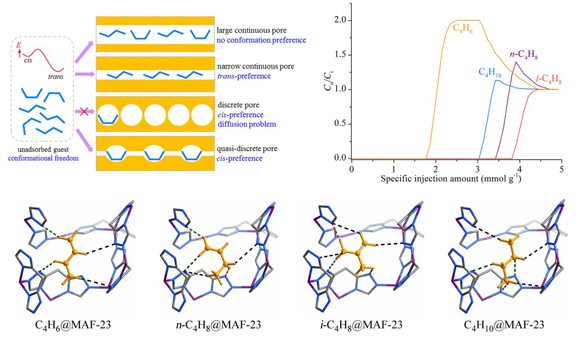 在上述工作的基础上,研究团队又提出了“控制柔性客体分子构型可反转吸附选择性”的概念,并对系列代表性多孔配位聚合物进行了实验和计算机模拟验证。利用研究团队前期设计合成的多孔配位聚合物MAF-23(J. Am. Chem. Soc.2012, 134, 17380),实现了反常而且最优的C4碳氢化合物吸附分离顺序。常温常压下将C4碳氢化合物的混合物通过MAF-23填充的固定床吸附装置后,丁二烯最先流出而且纯度很容易达到99.9%,同时避免了常规蒸馏和吸附纯化过程中因加热而产生的丁二烯自聚问题。