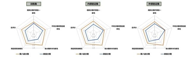 两版分期在训练集、内部和外部验证集中的比较(数值越小表现越好)