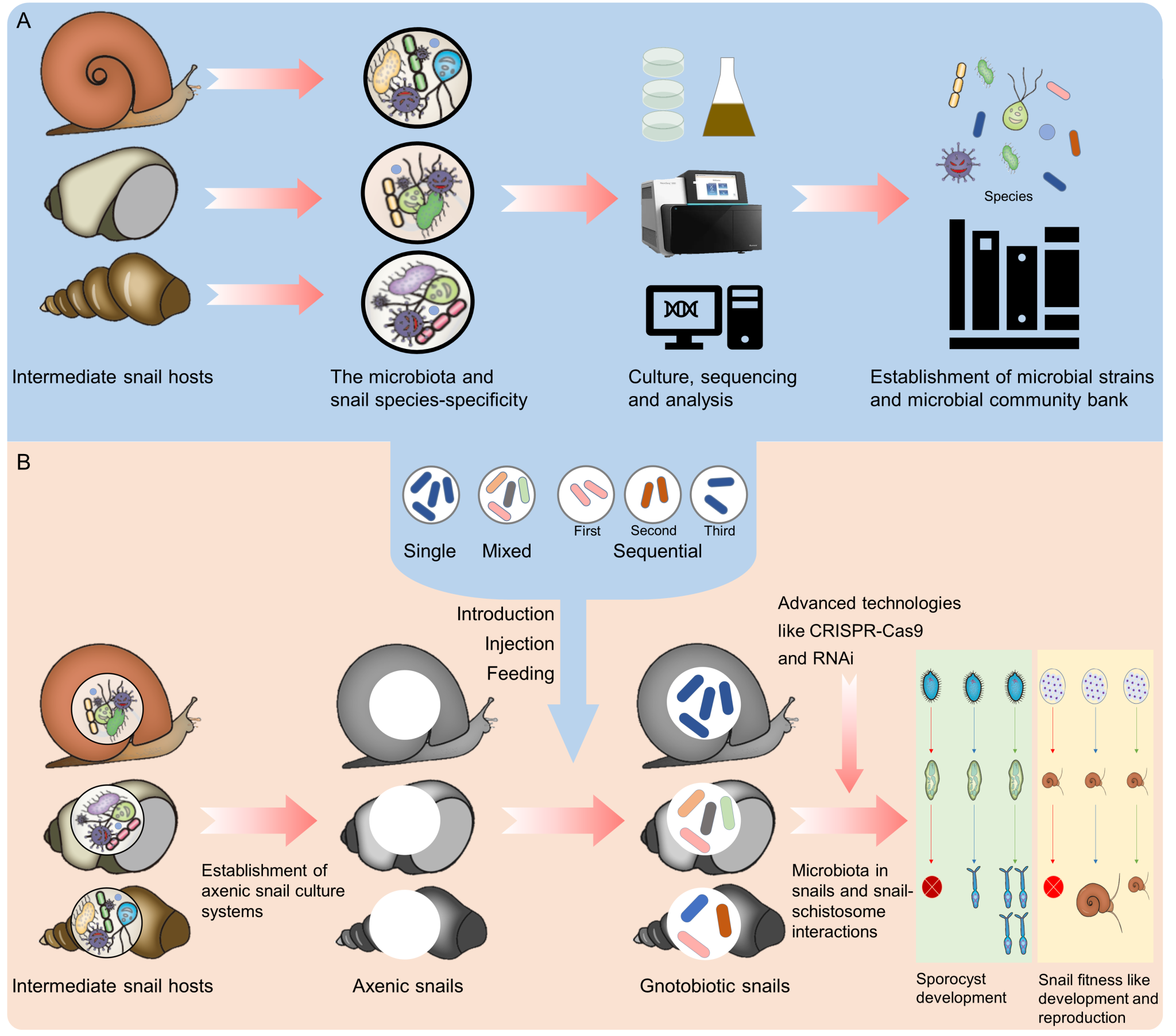 该综述系统回顾了无菌和限菌技术在螺类研究中的历史发展,着重介绍了历史上具有重大意义的无菌螺技术构建以及创新,并从分离技术、灭菌方式、营养供给以及饲养方法等方面评价了近年来发展的无菌和限菌技术;重点讨论了无菌和限菌技术作为有价值的研究模型的发展和应用,提出在无菌螺(Axenic snails)和悉生螺(限菌螺,Gnotobiotic snails)模型研究的基础上,结合多组学技术和基因改造工程技术,探讨使用无菌和限菌螺技术来研究微生物定植在宿主螺的生理功能及在螺-血吸虫互作过程中作用及机制,为更深入地了解微生物群-宿主-寄生虫的相互作用提出了新的策略和思路。
