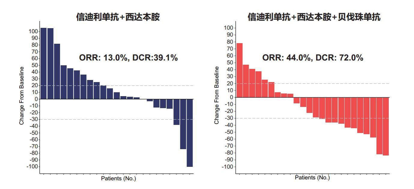 图2. 两药组(左图)和三药组(右图)患者的肿瘤缓解表现
