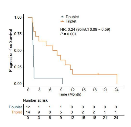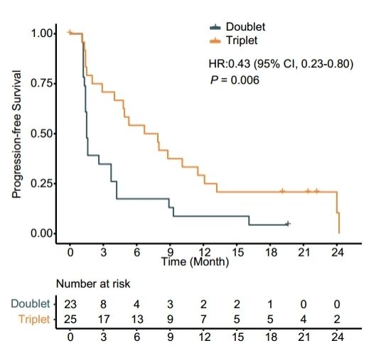 图1. 两药组与三药组的无进展生存时间曲线