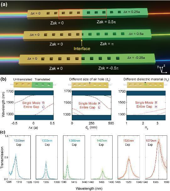 研究团队将光子晶体纳米桥中空气孔的“平移参数”作为新的合成维度,提出了一种基于合成平移维度的片上拓扑光子晶体纳米桥滤波器的设计方案。如图1(a)所示,将不同平移量的光子晶体纳米桥拼接形成拓扑光子晶体纳米桥微腔。由于拼接处左右光子晶体具有不同的扎克相位(Zak phase),因此界面处支持局域腔模。进一步改变拼接处右侧光子晶体的平移量,从而实现了不同波长的光输出。基于合成平移维度设计的拓扑光子晶体微腔相较于基于缺陷结构的传统光子晶体微腔具有多个优势。如图1(b)所示,基于缺陷结构的微腔存在腔模波长覆盖范围窄或非单波长滤波等问题。然而,基于合成平移维度的拓扑微腔,通过空气孔平移量的改变,微腔腔模可以覆盖整个光子晶体禁带带隙(>300 nm,覆盖光通信波段的大部分O波段,整个E,S,C波段以及大部分L波段)。且每个微腔仅支持单个腔模,可以实现单波长滤波。实验上,研究团队制备了具有不同平移量的片上拓扑光子晶体纳米桥样品,如图1(c)所示的测量结果证实了片上拓扑光子晶体纳米桥滤波器在宽波长范围内的选择性单波长滤波。