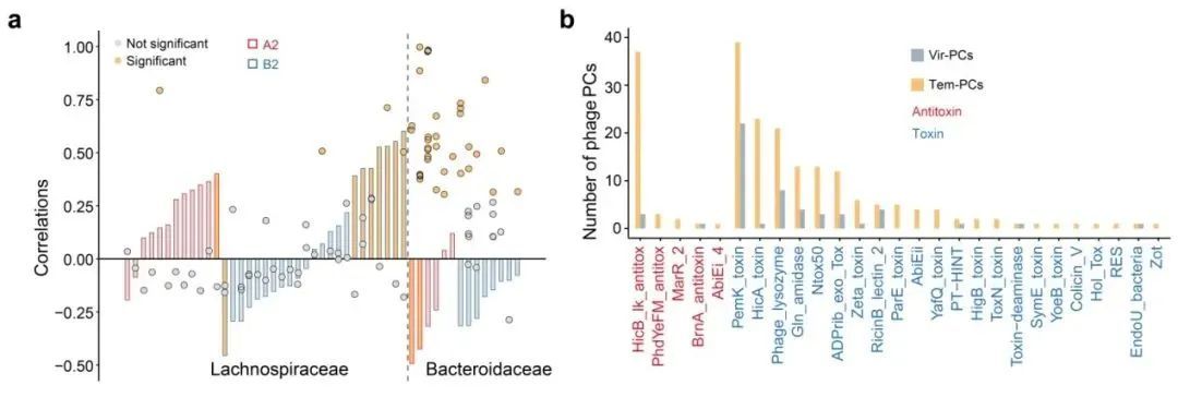 基于以上结果,研究人员分别使用病毒宏基因组和总宏基因组探究了裂解型噬菌体和温和型噬菌体的群落动态。结果发现,在长臂猿肠道中,对于高食叶比例进行响应的噬菌体类群主要是寄生在毛螺菌科(Lachnospiraceae)微生物(与纤维素代谢功能有关)的裂解型噬菌体,其只会部分杀死宿主(Cull-the-Host);而对于高食果比例进行响应的噬菌体类群主要是寄生于拟杆菌科(Bacteroidaceae)微生物(与多糖水解发酵功能有关)的温和型噬菌体,其随宿主进行复制(Piggyback-the-Host)。对两种生活方式的噬菌体的功能进一步研究发现,相比于裂解型噬菌体,温和型噬菌体与原核微生物宿主间存在着更为广泛的水平基因转移,并且在天行长臂猿的高食叶期,温和型噬菌体会显著富集一些与原核微生物宿主适合度有关的毒性-抗毒性(TA)基因。