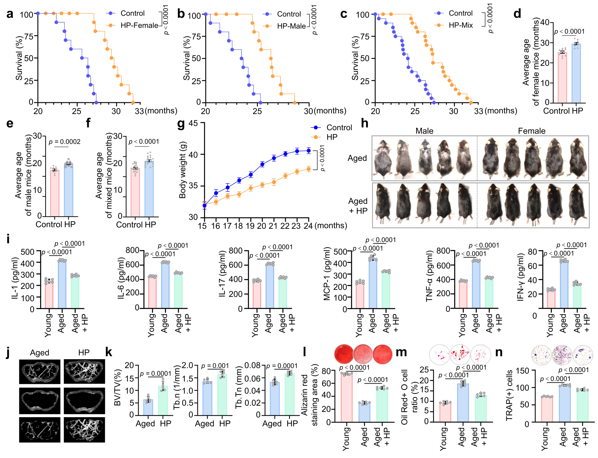 图2. 间歇性低压(HP)可延长中老年小鼠的寿命并减少衰老相关表型