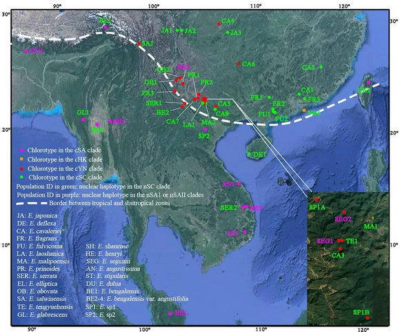 课题组共采集了我国及东南亚地区枇杷属的23个物种47个居群(图2),共计817个体(包括云贵高原的12种19居群),选用3个叶绿体片段和5个核基因片段进行群体测序,同时选取33个枇杷属代表性个体进行浅层基因组测序,提取其叶绿体基因组及197个单拷贝核基因等,基于系列群体遗传与系统发育方法等开展了枇杷属的演化历史研究。结果发现:(1)位于云贵高原的热带及亚热带过渡区多个枇杷物种检测到由杂交渐渗事件导致的核质冲突和叶绿体捕获;(2)枇杷属起源于亚洲的热带区域的始新世,随后中新世东亚季风气候加强和全球变冷改变了热带及亚热带过渡区的位置,导致大量物种的二次接触并发生种间杂交。本研究为揭示古气候变化对气候过渡带区域植物杂交和多样性起源提供了新的视角。