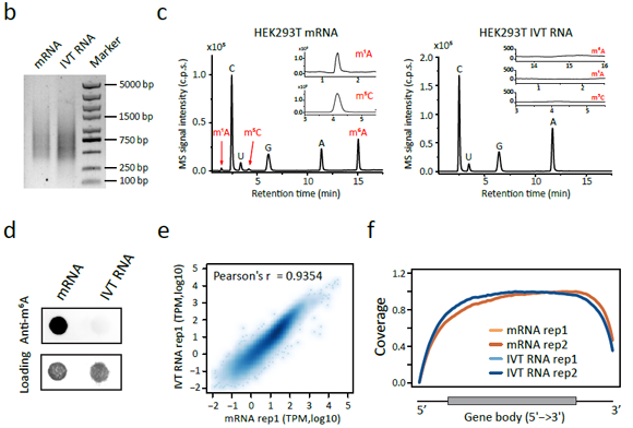 图1 体外合成RNA文库(IVT RNA)具有与内源转录组相似的表达量,但不含有修饰碱基。