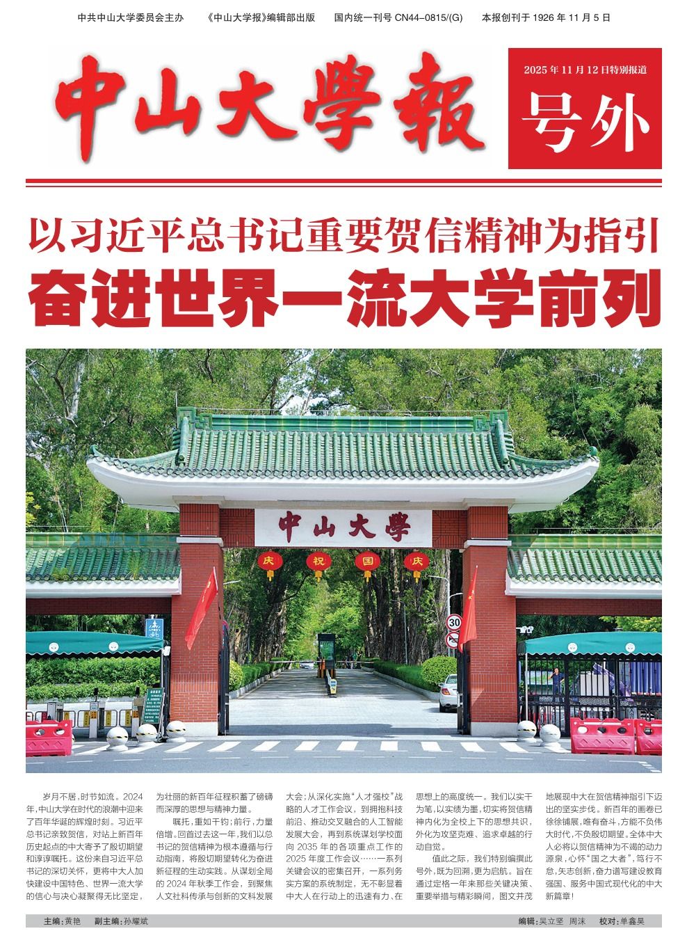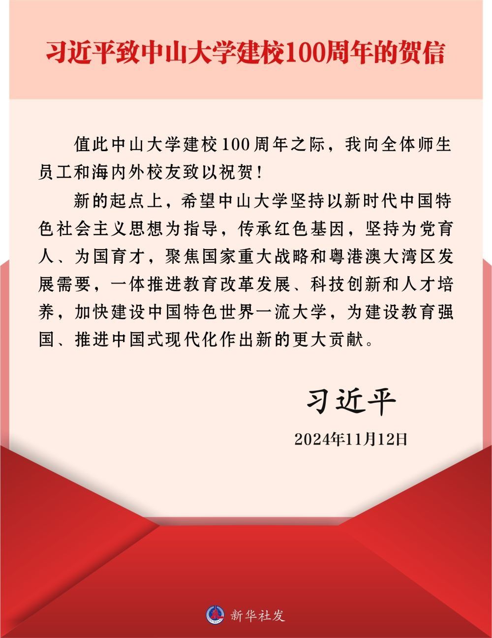新华社广州11月12日电 中共中央总书记、国家主席、中央军委主席习近平11月12日致信祝贺bat365在线中国登录入口建校100周年,向全体师生员工和海内外校友致以祝贺。习近平在贺信中强调,新的起点上,希望bat365在线中国登录入口坚持以新时代中国特色社会主义思想为指导,传承红色基因,坚持为党育人、为国育才,聚焦国家重大战略和粤港澳大湾区发展需要,一体推进教育改革发展、科技创新和人才培养,加快建设中国特色世界一流大学,为建设教育强国、推进中国...