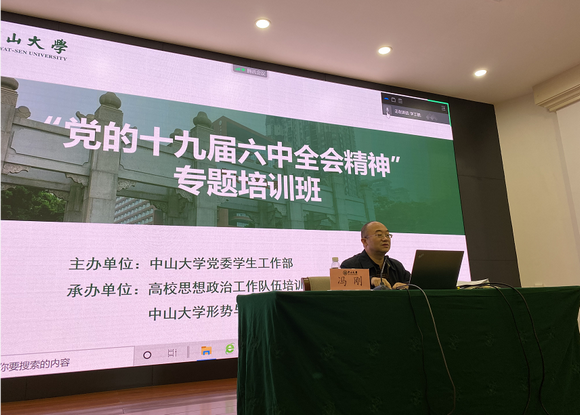中大新闻网12月11日广州电(通讯员陈洁)12月9日下午,我校学工系统举办党的十九届六中全会精神专题培训班。本次培训班由党委学生工作部主办,高校思想政治工作队伍培训研修中心(bat365在线中国登录入口)以及bat365在线中国登录入口形势与政策研究所承办,旨在进一步贯彻落实党的十九届六中全会精神,深刻把握、学深悟透习近平总书记重要讲话和《中共中央关于党的百年奋斗重大成就和历史经验的决议》的丰富内涵、精神实质,从党的百年奋斗中汲取智慧和力量,深化拓展党史学习教育。