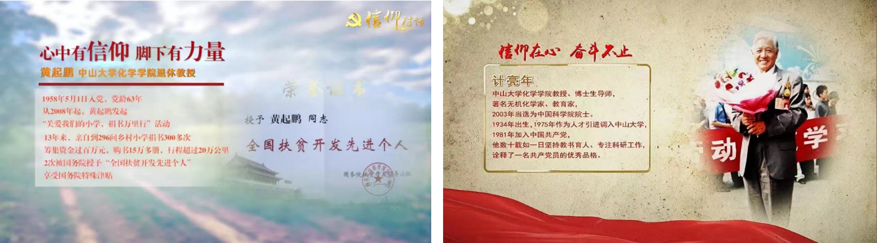 学院党委举办党支部建设专题培训班,面向全体党支部委员集中开展党史专题学习及党务知识培训;组织党员参观农讲所、中共三大会址、广州起义烈士陵园等,通过实地参观、沉浸式教学,缅怀革命先烈,感悟党的初心;开展“信仰对话”活动,寻访拍摄黄起鹏、计亮年、陈小明三位老党员,让学生党员从老一辈党员讲述初心使命和诠释爱党真情中学党史、悟思想;制作《捐书万里行——黄起鹏教授捐书画册》,出版《从学徒工到中国科学院院士——计亮年传》,传承红色基因;组织观看《长津湖》《悬崖之上》等优秀党史主题影视作品;21个党支部100%召开党史学习教育专题组织生活会,学院党委全体委员除作为普通党员参加本支部组织生活会外,均列席除本支部外的党支部的专题组织生活会。