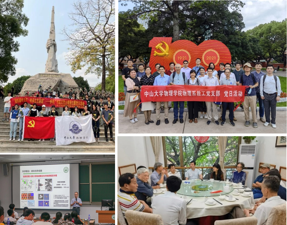 开展主题党日活动,追寻红色足迹。学生第四党支部赴广州起义烈士陵园开展党日活动,开展“缅怀革命先烈,传承红色基因”清明祭扫活动,体悟百年党史的波澜壮阔。物理学系教工党支部赴第一次全国劳动大会旧址和广州农民运动讲习所参观学习,追寻红色足迹,重温先辈伟大革命精神。军训期间,光学与光学工程学系教工党支部代表赴深圳校区看望新生并交流座谈,向学生介绍专业及就业前景。离退休教工党支部召开“建党百年新成就”座谈会,老同志恰逢建党百年的伟大时代,亲历物理学院的发展,对青年一代的成长提出了殷切期望。
