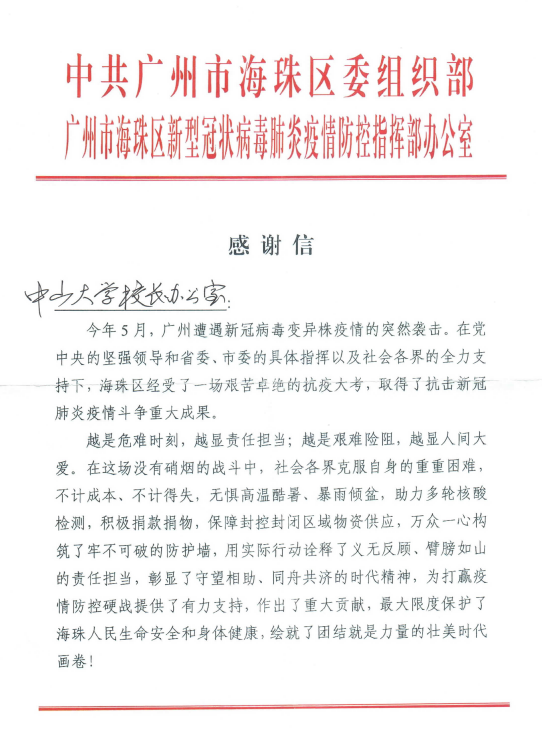 5-6月,校长办公室党支部坚决贯彻学校党委对疫情防控工作的统一领导、统一指挥和统一行动,充分发挥先锋模范作用,努力围绕中心服务大局,推进疫情防控期间各项工作部署落实到位。5月30日~6月27日,共统筹全校师生员工及教师家属完成四轮核酸检测,累计115716人次,收到中共广州市海珠区委组织部、广州市海珠区新型冠状病毒肺炎疫情防控指挥部办公室发来感谢信;6月份,为兼顾疫情防控要求以及广大毕业生诉求,支部及时调整工作方案,通过“主会场+培养单位分会场+线上直播”的形式,开设了112个分会场,于6月28日顺利完成了本年度的学位授予仪式。此外,校长办公室作为学校集中培养工作领导小组秘书单位,在学校全面推进集中培养的工作中,充分发挥支部战斗堡垒作用,统筹协调教学、后勤、院系搬迁、学生调迁等各方面保障工作,攻坚克难,确保近8000名本科新生顺利入学。