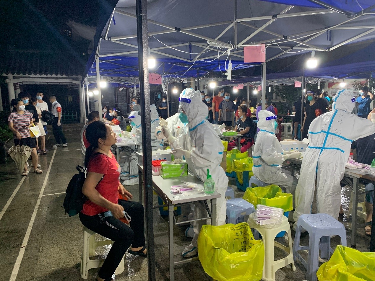 5月31日晚,雷雨交加。以附属口腔医院珠江新城门诊医护为主体组成的应急突击队雨夜集结驰援荔湾区支援核酸检测,奋战至下半夜,最终完成近8000人次的采样工作。