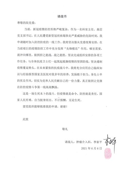 党支部书记李家平的请战书(来源:附属第一医院)