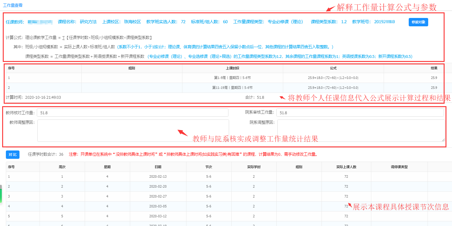 系统还人性化、全方位为教师展示教学工作量的整个计算过程。系统通过解释计算公式与参数,并将教师个人任课数据代入并展示计算过程,力求让教师清晰了解系统工作量计算结论的因果关系,确保教师一目了然。