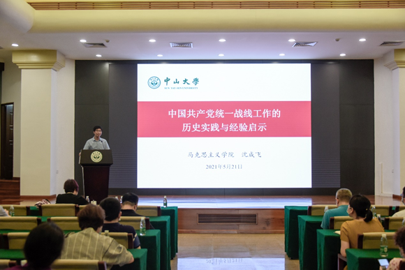 中大新闻网讯(通讯员何婉文)为庆祝中国共产党成立100周年,全面回顾民主党派同中国共产党团结合作的奋斗历程,发扬光荣传统,推动我校统一战线深入开展党史学习教育,近日,党委统战部在广州校区南校园举办党史学习教育专题讲座,邀请到马克思主义学院副院长沈成飞教授作题为《中国共产党统一战线工作的历史实践与经验启示》的专题讲座。学校各二级党组织统战委员、各民主党派省直基层组织、统战团体领导班子成员和骨干近130人参加本次讲座。讲座由党委统战部常务副部长吕雅璐主持。