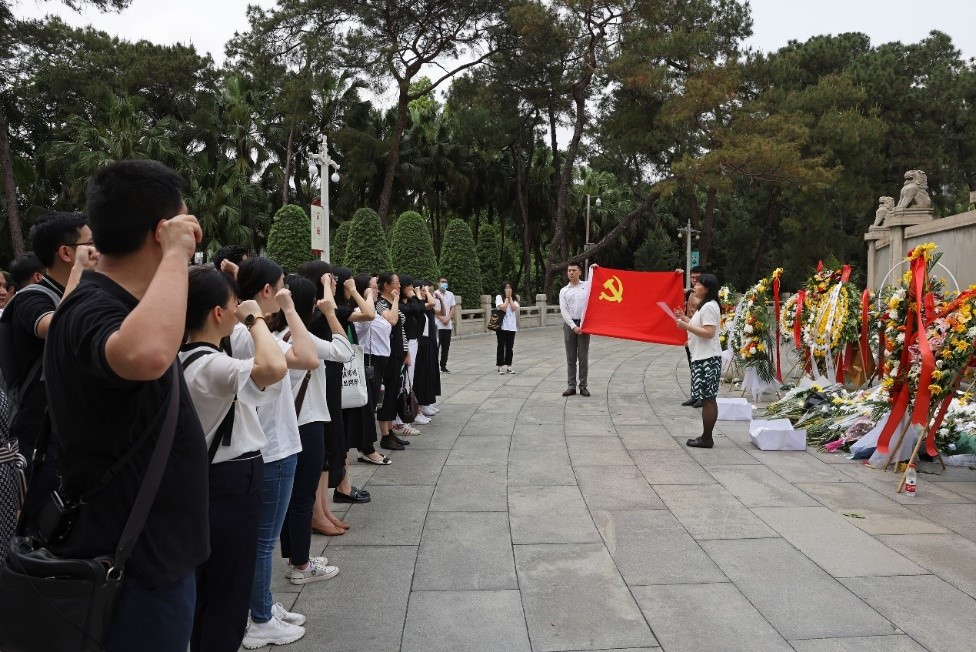 随后,全体党员在讲解员的带领下,瞻仰了广州起义烈士纪念碑,回顾了广州起义这段壮烈而峥嵘的革命岁月。在烈士墓前,党员们全体肃立,默哀致敬,并献上自己亲手制作的小白花,表达对革命先烈的崇高敬意和深切哀思。党员们在鲜红的党旗下重温入党誓词后,沿烈士墓缓步绕行,缅怀先烈。在“血祭轩辕亭”前,聆听了周文雍和陈铁军等英烈英勇就义的事迹。最后,全体党员参观了广东革命历史博物馆。