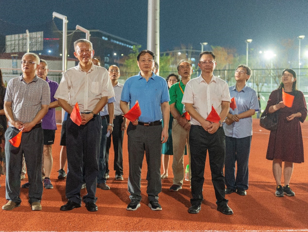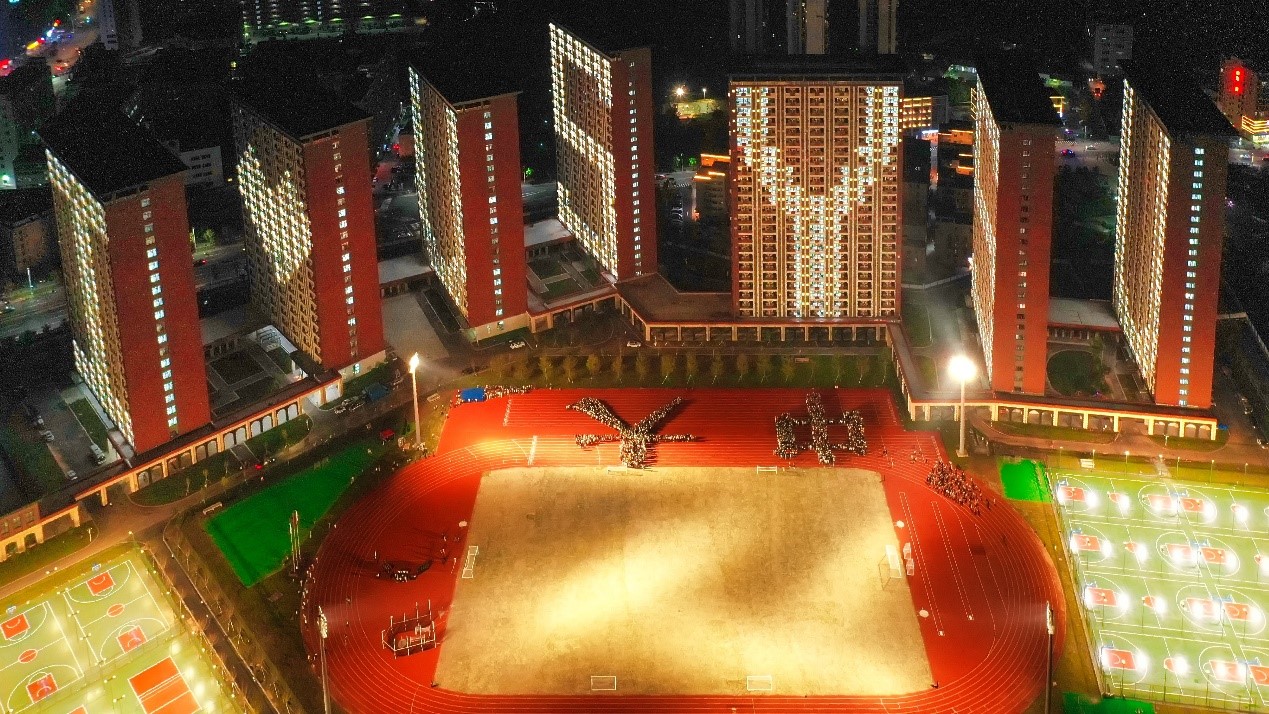 晚上20时,亮灯仪式开始。“我和我的祖国,一刻也不能分割……”运动场上,鲜艳的五星红旗迎风飘扬,同学们挥舞着国旗,一起合唱《我和我的祖国》,在田径场上摆出“中大”造型,表达对伟大祖国的热爱、对中大的热爱,并向深圳校区建设者们致敬。