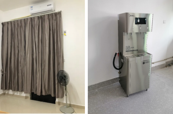 学生宿舍空调和风扇(左) 、学生宿舍公共区域直饮水设备(右)