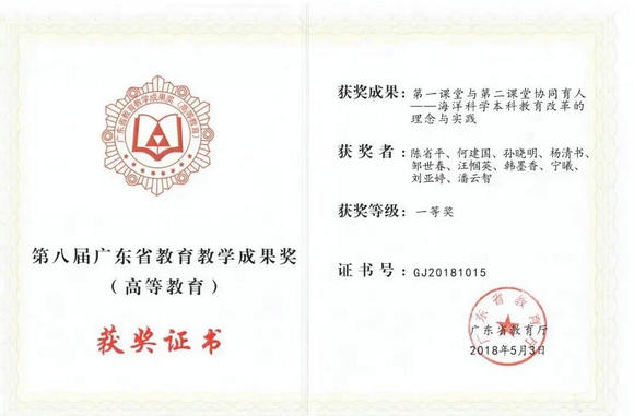 海洋科学学院育人成果获得第八届广东省教育教学成果一等奖(来源:海洋科学学院)