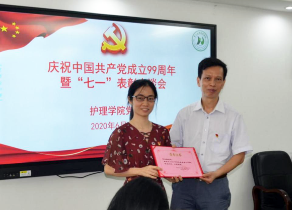 接着是颁奖环节。护理学院党委书记陈昌龄为获得“优秀党务工作者”称号的何笑霞同志、获“优秀共产党员”称号的李琨同志颁发证书。