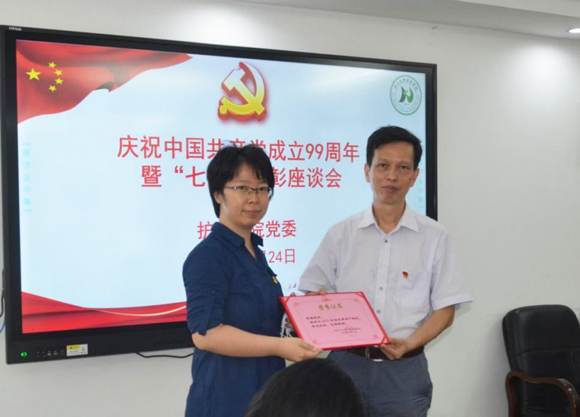 陈昌龄书记为优秀党务工作者何笑霞老师颁发荣誉证书
