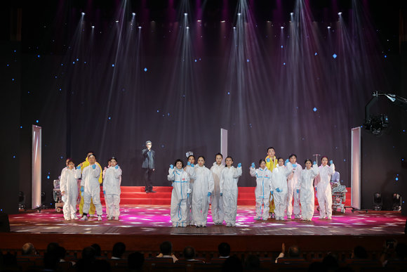 附属第六医院艺术团、援鄂医疗队全体队员表演音乐情景剧《医者》(来源:党委宣传部)