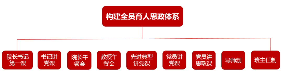 学院党委坚持立德树人根本任务,持续十一年的“我心目中的良师”评选活动带动和激励了一批敬业爱生的教师典范;打造形成了“全员育人”体系,包含了书记院长第一课、书记讲党课、院长午餐会、教授午餐会、先进典型讲党课、党员讲党课、党员讲思政课、导师制和班主任制,全院教职员工调动起来,构建全员、全过程、全方位的“三全育人”体系。