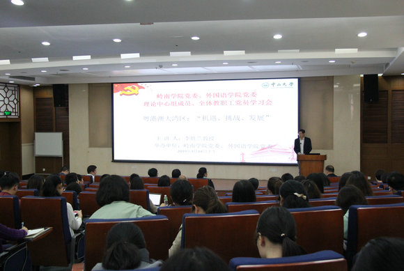 近日,岭南学院党委、外国语学院党委在MBA大楼402会议室联合举办了《粤港澳大湾区发展规划纲要》学习会,邀请广东经济形势报告团宣讲专家李胜兰教授作题为“粤港澳大湾区:机遇、挑战、发展”的辅导报告。两院党委理论中心组成员、全体师生党员参加了会议,会议由岭南学院黄山书记主持。
