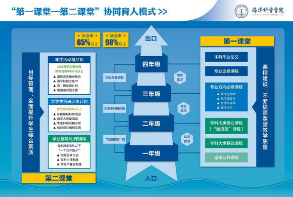 基于第一和第二两大课堂相对脱节、跨校区办学等现实情况,我们实施了双班主任制、团藻促学计划、师生午餐会、海洋大讲堂、本科生导师制等制度,将专业教师、辅导员、实验教辅人员、教学管理人员和学生有机联系在一起;安排专门实验技术人员担任团委副书记,负责动员、引导、组织、策划、指导、保障本科生参与课外科研创新训练;通过海洋科技文化节、两岸四地海洋夏令营、海精灵志愿者协会、海?阳体育计划等方式,推进学生活动的精品化,以期让优秀的学生更加优秀。除了学校层面的评教和听课以外,我们还通过学院本科生事务委员会听课、师德考核小组听课、学生评教等途径,构建课程质量反馈控制体系,面向一、二、三年级所有专业课程全覆盖,实现对完美教学质量的不断追求。