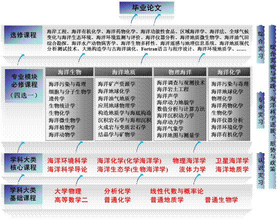 在二年级秋季学期结束时按海洋生物、海洋地质、物理海洋、海洋化学“四选一”分流培养,学生通过专业方向必修课程学习,系统掌握各方向基本研究原理和方法,为专业综合提升建立基础。