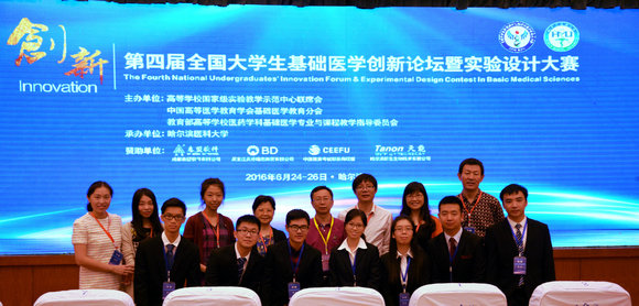 6月24-26日,由高等学校国家级实验教学示范中心联席会、中国高等医学教育协会基础医学教育分会和教育部高等学校医药学科基础医学专业与课程教学指导委员会联合主办的“第四届全国大学生基础医学创新论坛暨实验设计大赛”在哈尔滨医科大学举行。本次大赛由包括北京大学、复旦大学、bat365在线中国登录入口、协和医科大学、华中科技大学、中南大学等90余所院校在内的395支大学生队伍参赛。该比赛是医学院校仅次于临床技能大赛的全国性比赛,大赛规格高、参赛院校多、参赛选手强、竞争异常激烈。比赛设一、二、三等奖,分别占参赛队伍的10%,20%和30%,每个学校最多只能选派6支参赛队伍。