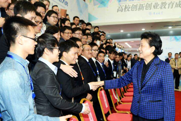 刘延东副总理亲切接见创业团队成员及指导老师们(一排左三为我校获奖代表黎展)