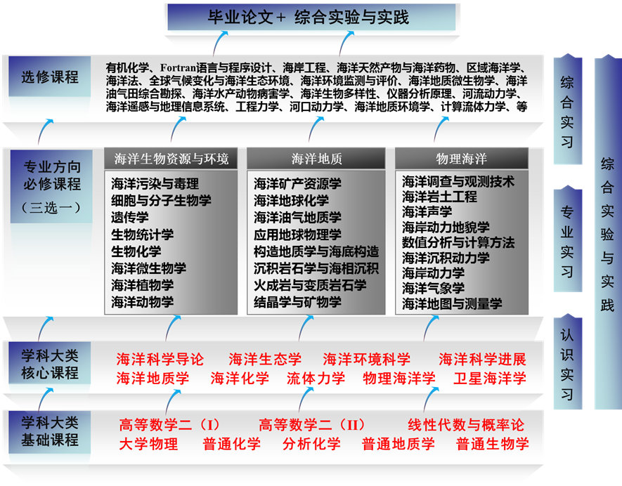 “综合提升”板块包括“实践课程+选修课程”。综合提升板块目的在于巩固提升海洋科学理论基础,以及海洋生物、海洋地质或物理海洋学专业知识,形成专业素养。充分利用三学期制度,加大创新实践能力培养,注重“专深”与“广博”结合,推进弹性课程体系和授课方式,调动学生学习兴趣和主动性,为其更自主、个性化的学习创造条件。专业选修课则面向海洋领域学术前沿、行业应用等不同发展路径设置多样化的课程模块。其中,实践课程包括:海洋科学认识实习、海洋科学专业实习、海洋科学综合实习、综合实验与实践、毕业论文。选修课程包括:有机化学、Fortran语言与程序设计、海岸工程、海洋天然产物与海洋药物、海洋功能性食品、区域海洋学、海洋法、全球气候变化与海洋生态环境、海洋环境监测与评价、海洋地质微生物学、海洋油气田综合勘探、海洋水产动物病害学、海洋生物多样性、海洋遥感与地理信息系统、海洋地质现代分析测试技术、仪器分析原理、大地构造学与古海洋演化、海水养殖、河流动力学、计算流体力学、工程力学、海洋学中的资料分析方法及MATLAB应用、海洋环境地质学、近岸水质模型应用、河口动力学、等等。