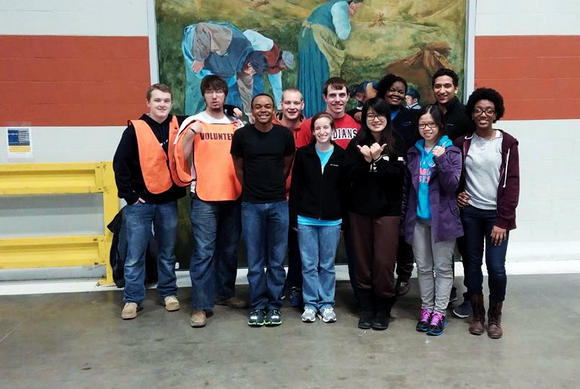 黎子君(右二)在当地食物银行Gleaners Food Bank做志愿者,发放食物,关爱贫困者