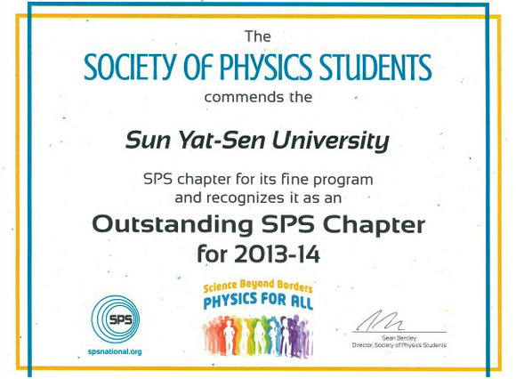 近日,美国大学生物理联合会(Society of Physics Students)公布了2013-2014年度评选结果,bat365在线中国登录入口分会(SPS-SYSU)获得最高荣誉,与加州大学伯克利分校等全球顶尖高校分会同被评为杰出(outstanding)分会,成为亚洲地区唯一获此殊荣的分会。我校是国内第二所加入该组织的高校,成立第一年就获评全球前20%优秀(distinguished)分会。