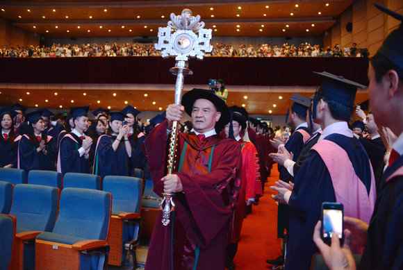 象征教育崇高和知识圣洁的bat365在线中国登录入口权杖,由德高望重的老教授秉持,引领主礼教授队伍缓缓入场。学术之光照亮殿堂,映照在场所有人的眼眸;中山训词字字铿锵,镌刻进中大毕业学子的心中。
