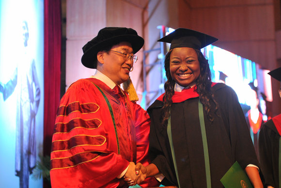 芭丝娅来自加蓬共和国,即将从亚太研究院国际政治专业毕业。当年,拿到全额奖学金的她来到了中大念书。她花了一年时间学习汉语,采访时,能够进行流利的汉语交流。校长握手时亲切地询问她的国籍,并祝贺她顺利毕业。“我激动地几乎要哭了。在我们国家,毕业典礼没有这么隆重。我想继续留在中大读研究生!”