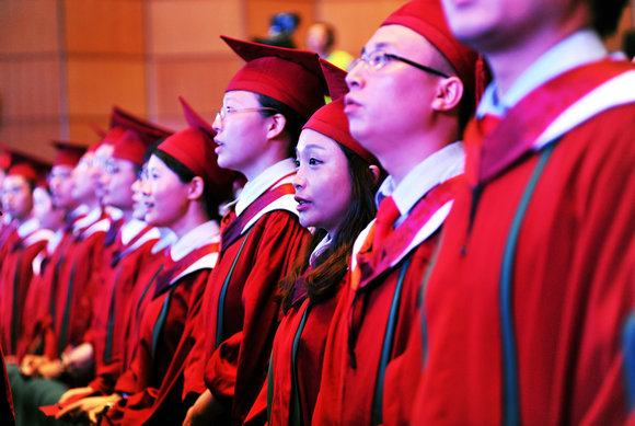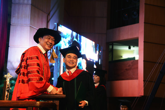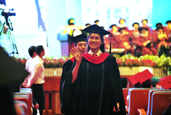 岭南学院硕士毕业生居年余上台和校长握手时,台下传来热烈的欢呼声,这位高人气的毕业生原来是2010级本科生辅导员,正巧今天和同学们一起毕业。与2010级学弟学妹在珠海一起度过的两年时间里,居年余和同学们建立了深厚的感情,“他们就像自己带大的孩子,今天他们毕业了,我心情很复杂,同时也觉得很幸福、很光荣。”
