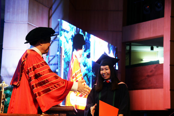 在观众席上,有许多父母用殷切的目光注视着主席台,等待自己的孩子上台的那一刻,佛山的朱先生就是这众多父母中的一个。他特意请假赶来中大参加儿子的研究生毕业典礼,见证儿子和校长握手,完成毕业仪式。对此,朱先生感到格外自豪。