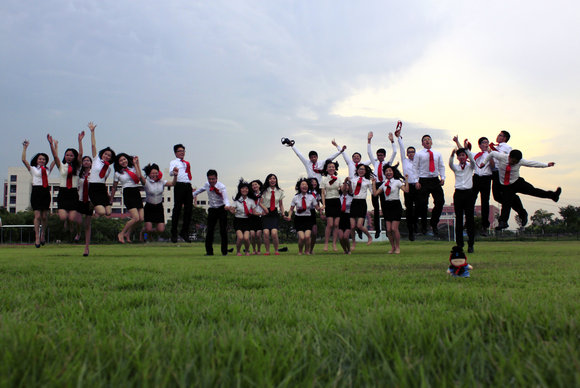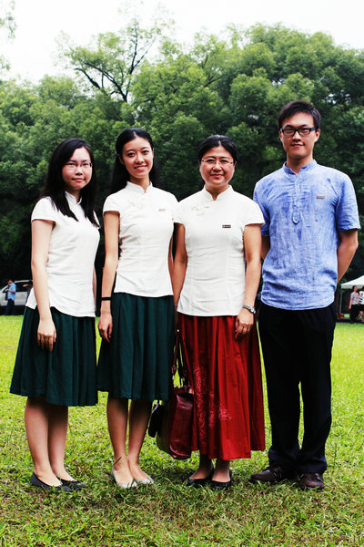 2010级软件学院电子政务班的同学则用“中西结合”的方式在东校区和南校区留下纪念。在东校区,他们用黑色长袍吟咏出毕业骊歌,用白色衬衣、红色领带致意青葱岁月。在南校区,他们用白色礼服和红色唐装画出另一道亮丽的风景线。“虽然软件学院一向是‘阳盛阴衰’,但是我们班却是女生比较多,所以我们才选择了礼服,给我们班的男生长长脸。”提起挑选这两套服装的过程,电子政务班的班长刘名越同学笑得十分开心,“因为没有挑到与礼服相配的男生服装,我们索性就选了非常喜庆的唐装”。怀士堂前,身着红色唐装的男生们拱手作揖,为离别的校园增添热闹的笑颜。格兰堂前,身着白色礼服的女生围成爱心,一个身穿红色唐装的男生“傲然”其中,“万花从中一点红”,羡煞旁人。