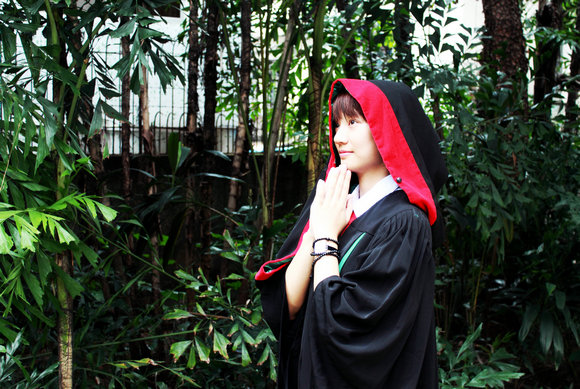 黑色的长袍也被本科毕业生们用来讲述一个又一个有趣的故事。继“魔法学校”的创意后,北校区公共卫生学院2009级的四个毕业生邓立伟、惠玮、马雅欣和黄泽清用学士服拍摄了一组“甄嬛”组图。“我们觉得学位服挺适合模仿清宫戏的,而且又找到了合适的场景。”谈起拍摄的缘由,“甄嬛脑残粉”邓立伟笑着介绍道。虽然来自不同的班级,但四个人从2011年起就一起组队参加科研项目,关系很好,所以希望在毕业的时候用这样的方式留下四个人共同的回忆。