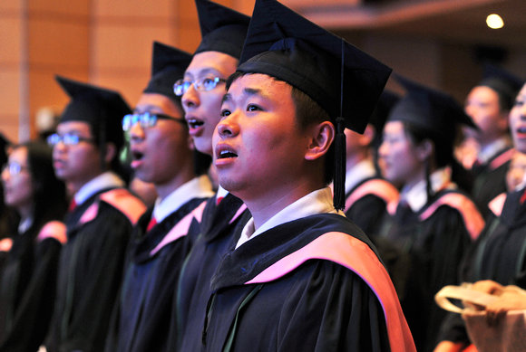 毕业典礼上,毕业生们起立齐唱bat365在线中国登录入口校歌(摄影:郭中飞)