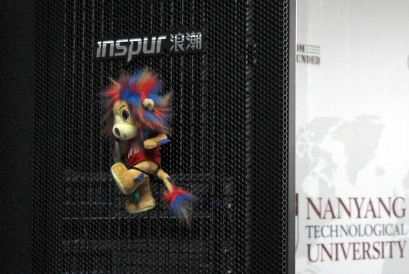 新加坡南洋理工大学首次参加国际大学生超算竞赛,在初赛中以海外总成绩第一而挺进总决赛。新加坡的多元文化成就了国际化的参赛队伍,队员们分别来自新加坡、印度、中国、越南等国家。在机柜上,一只身着“NTU”服饰的毛绒狮子玩偶默默支持着神色紧张的队员们。原来,狮子是南洋理工大学的吉祥物,狮子玩偶也是从校徽上的狮子演变而来的,队员开玩笑说“狮子已经从校徽上的四脚行走进化成两脚站立了”。