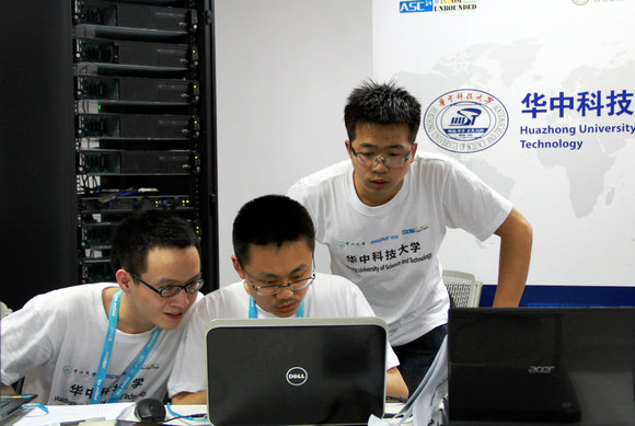 华中科技大学参赛队在ASC13成绩骄人,今年能否再创佳绩备受瞩目。队员何斌表示,今年的参赛队伍大部分来自学校的“联创团队”。联创团队创建于2000年6月,参加了国内外许多高水平的IT领域竞赛,成绩优秀。在Imagine Cup微软“创新杯”学生大赛中,该团队连续5年闯进总决赛,两次获得IT方向的全球总冠军。去年,以联创团队为主力的华中科技大学参赛队伍在ASC13中获MIC应用优化单项奖,总成绩排名第三,并代表中国参加国际大学生超级计算机竞赛决赛(ISC),获Linpack最高性能奖,刷新世界纪录。今年比赛队伍中也有2名去年参加了ASC的团队成员,经验丰富。在接待组志愿者的眼中,他们“很有趣,还会在紧张的准备过程中相互开玩笑”。