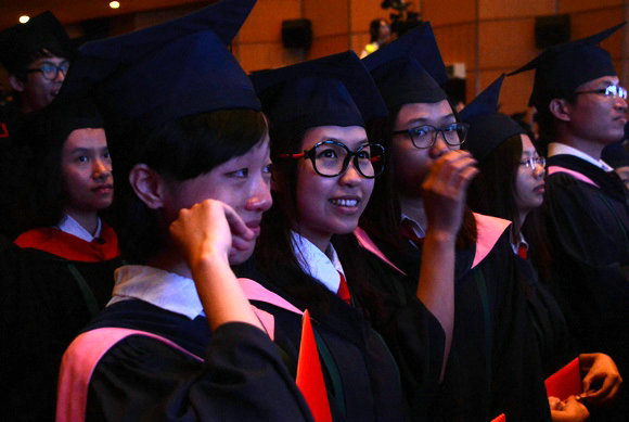 “毕业典礼现场热闹而肃静。唱校歌时,心情很激动;特别是教授进、退场时,告别曾经教导自己的老师们,更加激动。”