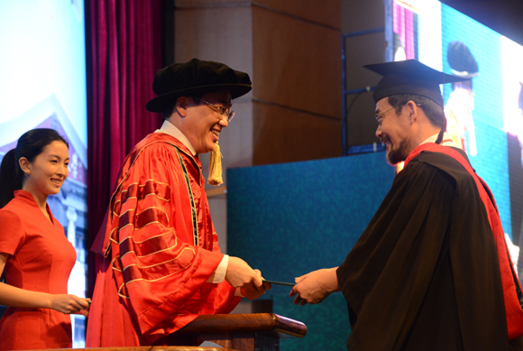 与此同时,二楼观礼场上的亲友们和端坐主礼台上的教授们也感受着这份感动和快乐!资讯管理学院李同学的母亲专程从杭州赶来,看到女儿从校长手中接过毕业纪念册时,心里很是骄傲。外国语学院Prof. Wendy Bowcher迎来她首批博士毕业生,目送着学生毕业,这位来自澳大利亚的教授倍受感动。