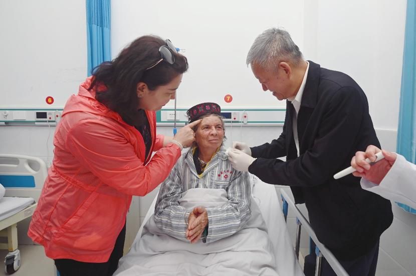 8月10日,高松校长在塔县人民医院为白内障患者马合托姆·马热菲揭开手术眼包